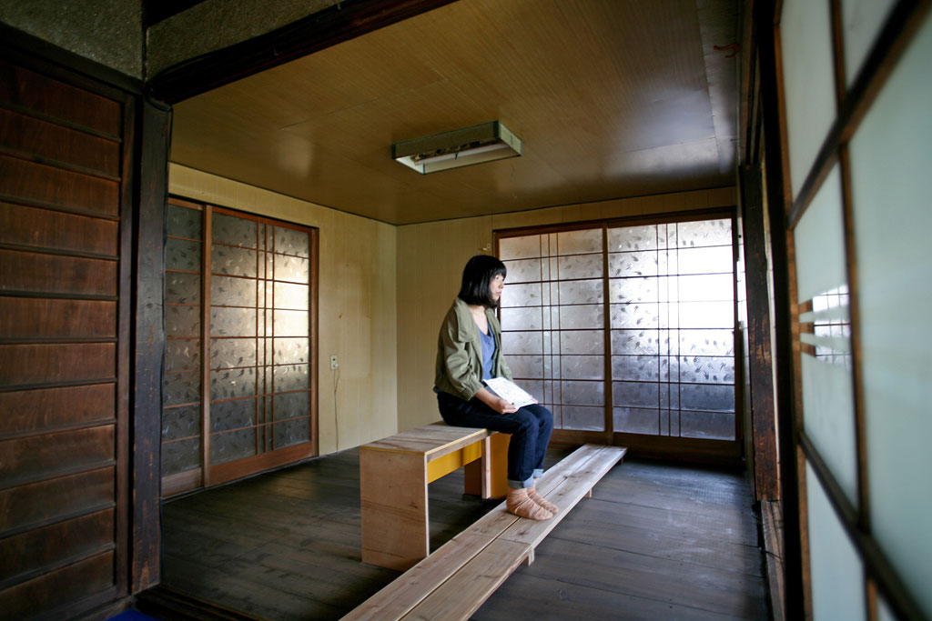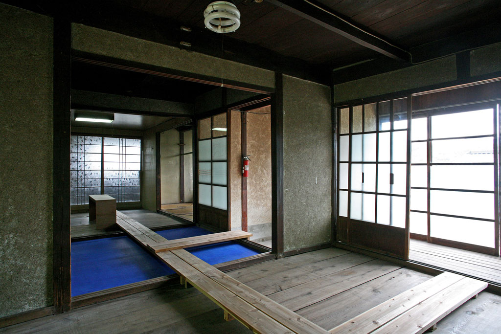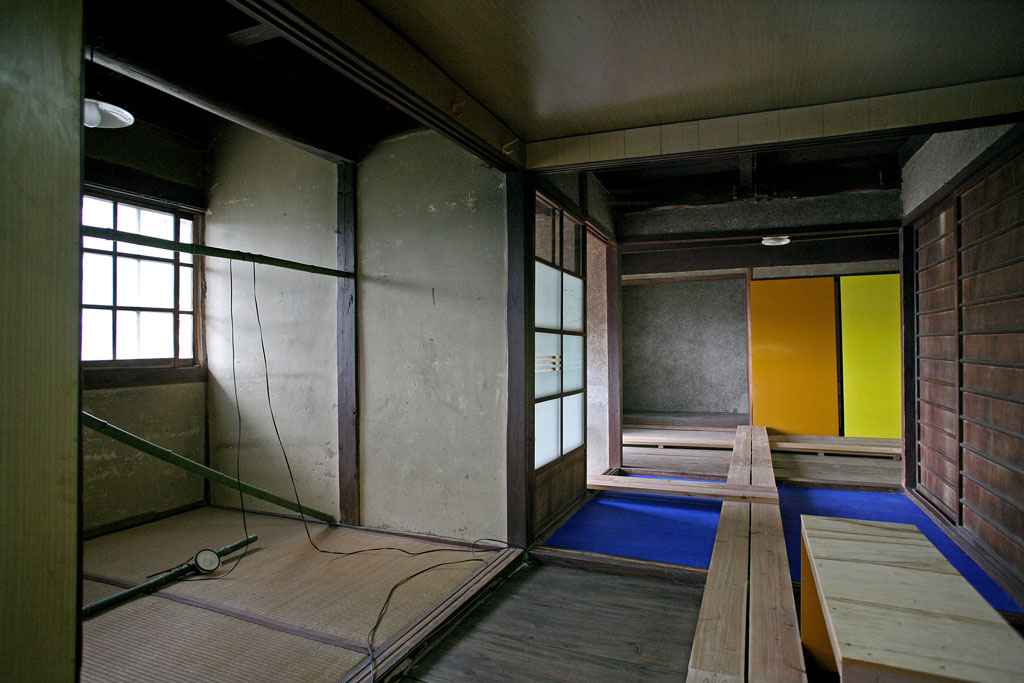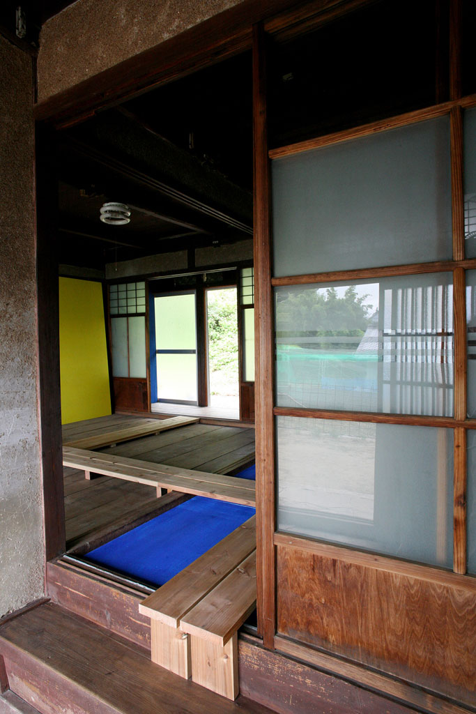 Tage-des-Geta collaborative installation with Stefan Rummel, japanese house, acrylic paint, board walk, outdoor platform, wood, bamboo, speakers, 4 sound tracks, Art Base Momoshima Island, Japan, 2013-2014