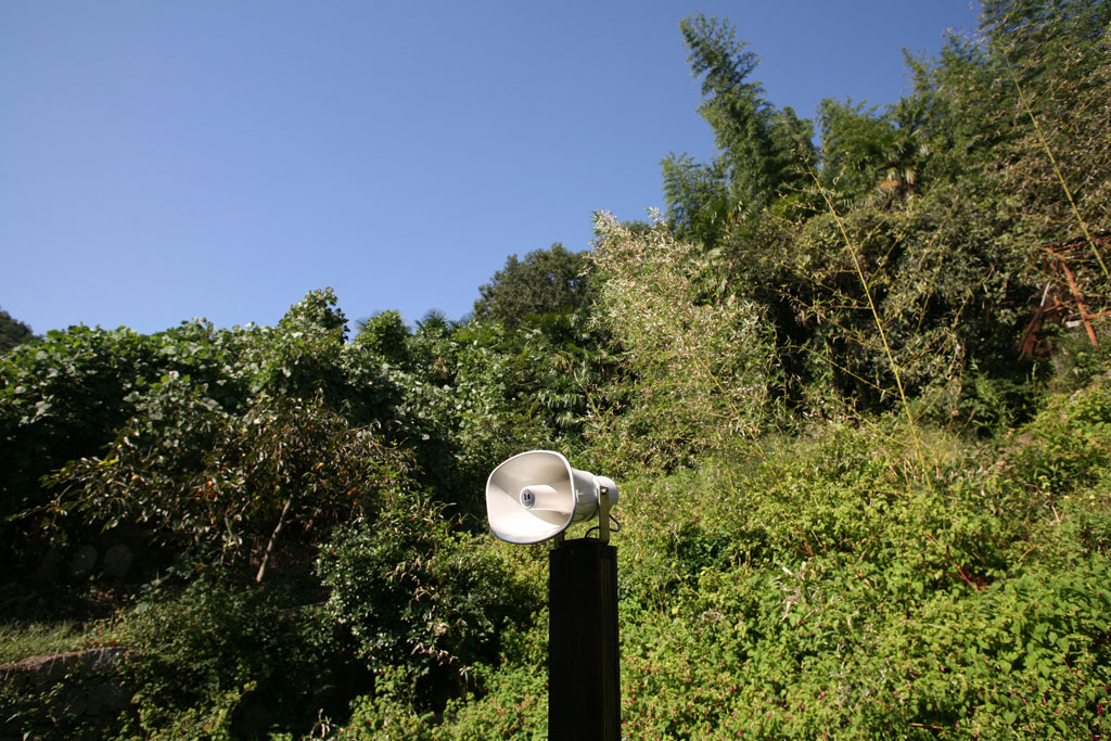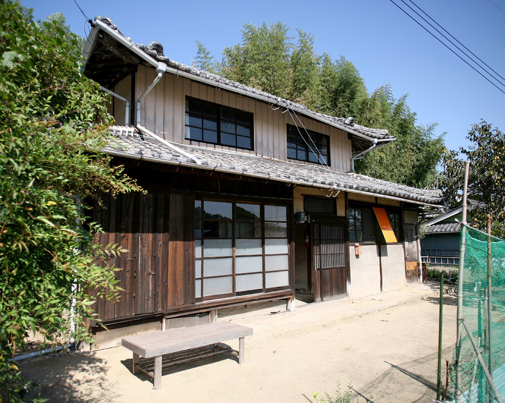 Tage-des-Geta Installation in Zusammenarbeit mit Stefan Rummel, japanisches Wohnhaus, Acrylfarbe, Holzsteg, Aussenplattform aus Holz, Bambus, Lautsprecher, 4 Tonspuren, Kabel, Art Base Momoshima Island, Japan, 2013-2014